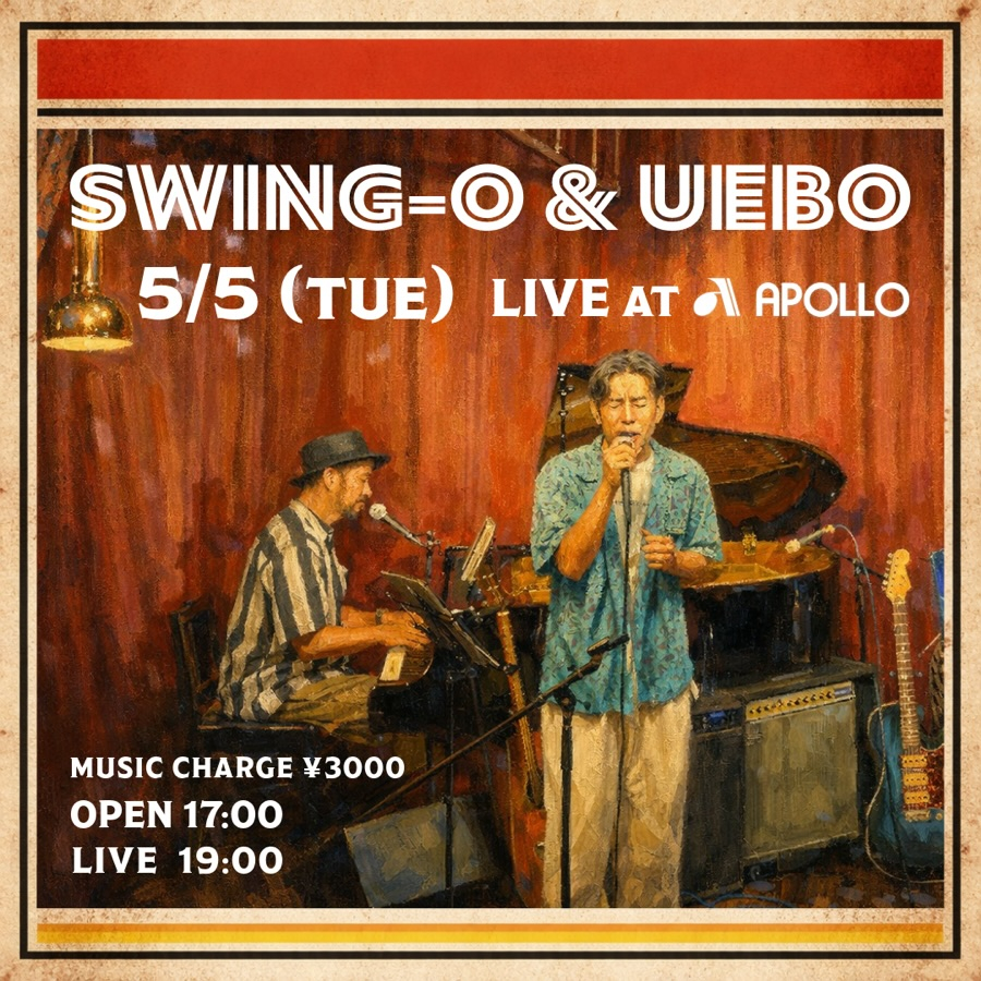 5/5(TUE)5/5(TUE) こどもの日は、音楽で遊ぶ日♪ 大人も子どもも関係なく、 いい音と一緒に集まりましょう! SWING-O(pf) UEBO(vo, gt) + APOLLO DJs SWING-O(pf) 日本を代表する […]